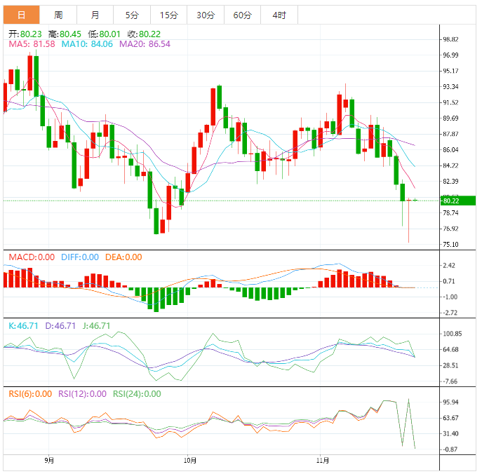 日线来看,接近了此前76.50一带的低点支撑区域,短线稍有放缓,可能又会陷入一定时间的拉锯震荡,周初可能还会反复争夺。能否跌破决定后市下行空间。4小时图二浪空间破低后形成加速放量。破位82.0颈线的弱势延续,而上周五的高点在82.50附近,此位是本周的多空临界点,此位之下短线相对偏空一些,而下方支撑点则要关注76.20低点,可能围绕低点进行拉锯争夺。