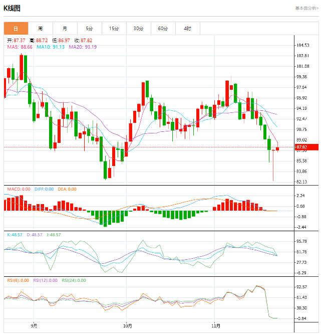 日线级别:震荡上涨;MACD金叉运行,KDJ金叉,短期移动均线向上偏离,如果能够突破10月10日高位93.61附近的阻力位,将在空中线增加一个看涨信号。