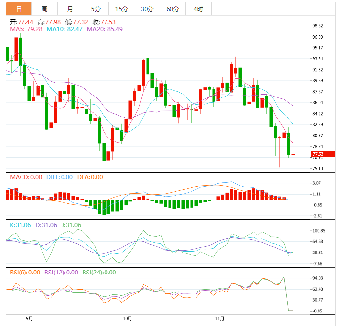 原油的疲软可能与2021年12月上升趋势线的下行突破有关,截至发稿时,该趋势线约为78.80美元。