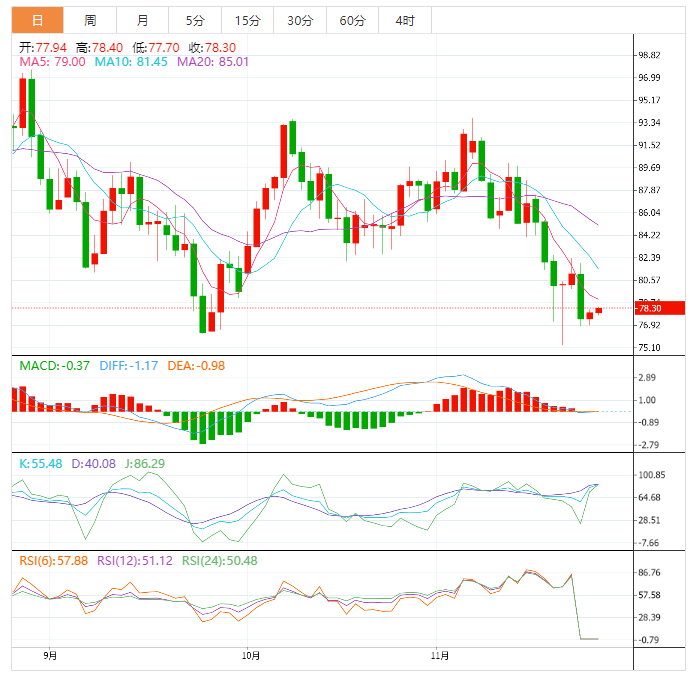 周五盘中,美油交投于78.33美元/桶附近;油价周四持于两个月低位附近,七国集团(G7)拟议的对俄罗斯石油的价格上限水平令人们怀疑这能在多大程度上限制供应,美国汽油库存增幅大于预期,以及疫情担忧,也给原油价格增加了下行压力,由于恰逢美国感恩节假期,交投淡静。