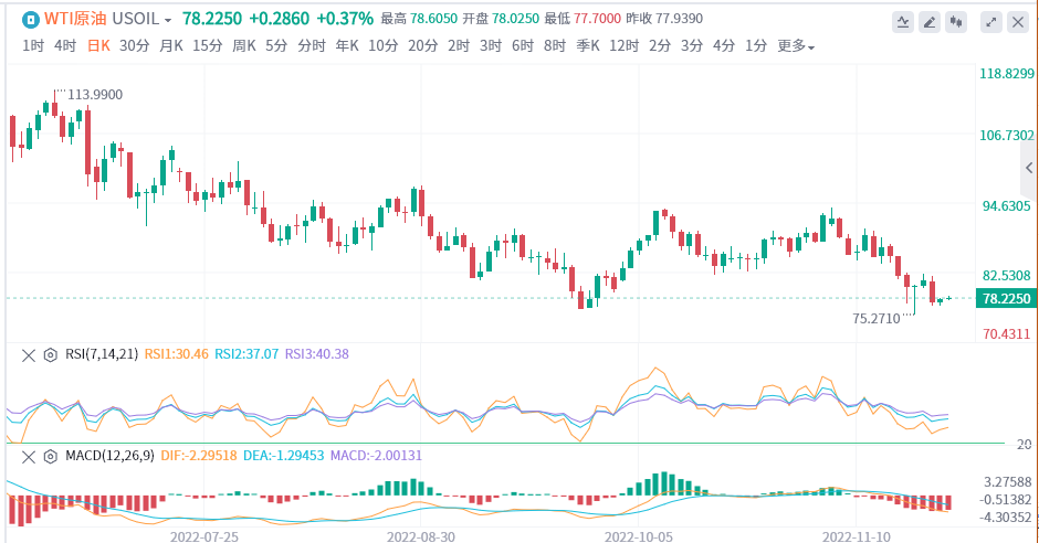 阻力位在78.93美元/桶,若突破该位,可能会让油价上涨至79.74—81.06美元/桶的区间。从日线图上看,油价在支撑位77.24美元/桶上方徘徊。