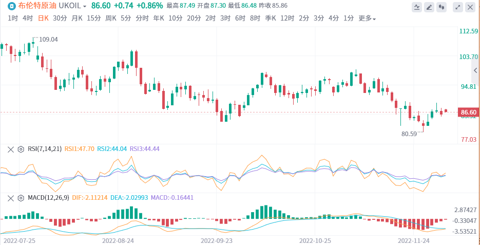 在日线图上,目前的上涨被认为是对从11月7日高点99.56美元/桶开始的下跌的反弹,或者是从83.65美元/桶开始的不规则平台型的第三段。