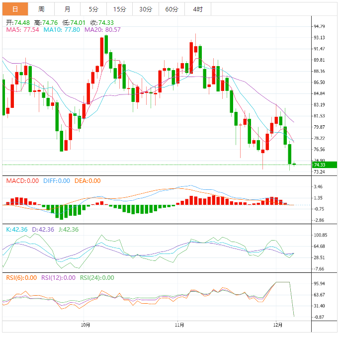 4小时图回撤79.60一线守住再反弹摸高,短线多空强弱延续不定,目前处于反弹结构当中,但趋势则处于下行当中,下行趋势线的反弹,而上周反弹的空间和幅度都有,本周存在冲高回落重新转下行的可能,只是这个拐点需要结合形态临盘而定,目前属于逼空反弹当中,进早了也容易被洗损,小时图进入收缩震荡下跌的去向。