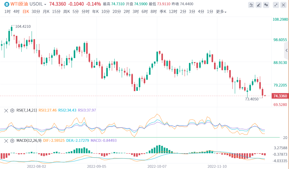 当前阻力位为75.49美元/桶,如果突破该阻力位,可能会让油价上涨至76.55-77.62美元/桶的区间。从日线图上看,油价将测试71.76美元/桶的支撑位。