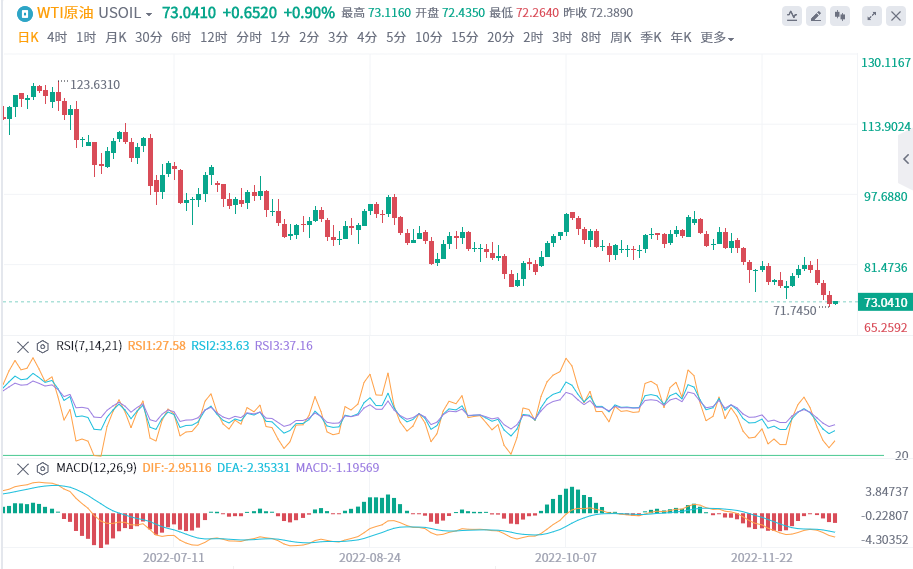 若跌破72.04美元/桶,可能会引发油价小幅下跌至70.72美元/桶。在日线图上,油价在71.76美元/桶处找到了支撑,这与小时线图上的72.04美元/桶共同作用,暂时阻止了下跌。