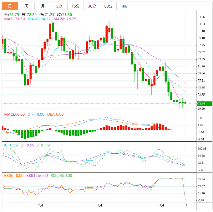 由于MACD的看跌信号不是特别强,KDJ的看跌信号有所减弱,盘面上已经严重超卖,预计70之上存在反弹的可能,需要提防油价探底回升或者低位震荡的可能性,而上方初步阻力在5日均线73.57附近。今日反弹高空为主,回踩低多为辅,上方短期关注74.3-74.5一线阻力,下方短期关注70.0-69.5一线支撑。