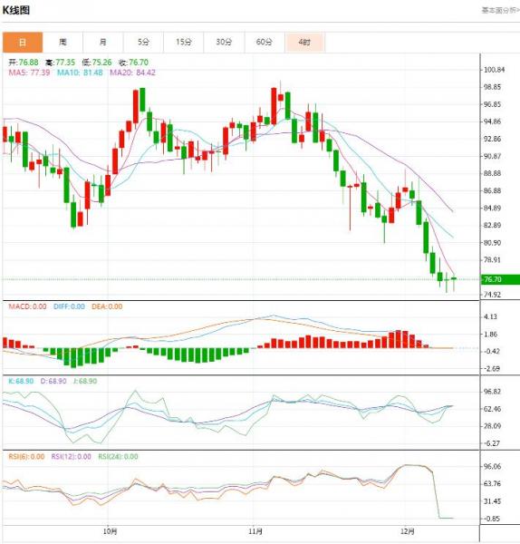 4小时级别:单边下跌;MACD底部偏离初始金叉后,KDJ在一个相对较低的水平形成了一个金叉,K线在70点附近记录了一条“斩回线”。注意布林线中间轨道73.32附近的阻力,如能突破阻力位,短期看涨信号将增强。