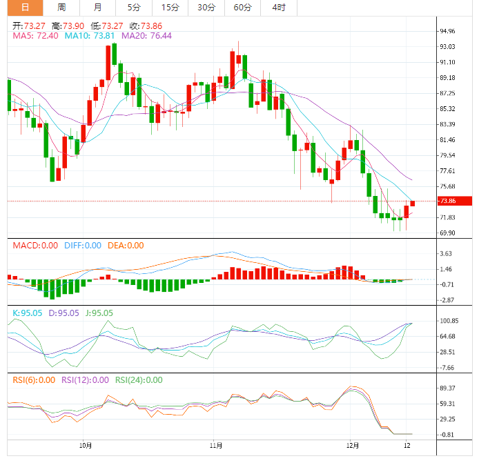 原油日线单边下跌均线空头排列,上一交易日录得较长上影线K线,上方卖压较强,短线油价面临进一步下探风险,70关口是初步心理支撑位所在,如果空头持续,那可能用处不大,下方现在还没有明显探底见底的信号,强支撑在去年12月20日低点66.12附近,12月21日低点68.56附近也存在一些支撑。