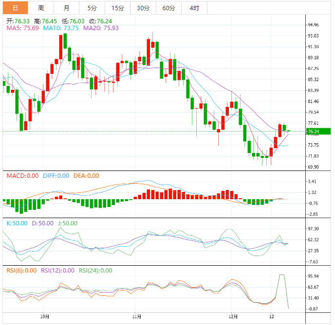 周五盘中,原油交投于76.25附近。油价周四下滑了约2%,因为美元走强和全球主要央行进一步加息,令交易商担心燃料需求前景。数据和分析公司OANDA的高级市场分析师Edward Moya说,“原油价格走低,因为在多家央行进行了又一轮强有力的收紧政策行动后,全球经济衰退风险增加,随着避险情绪快速升温,油市最近的反弹失去动能。”美联储主席鲍威尔周四表示,将在明年进一步提高利率,即使经济可能陷入衰退。周四,英国央行和欧洲央行也加息以对抗通胀。