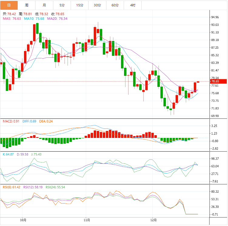 原油日线走势图显示,目前MACD双线交织在零轴附近徘徊,KDJ金叉,5周均线上穿10周均线,短线偏向企稳,留意前期低点73.0附近支撑,若失守该位置,则可能会进一步跌向布林线下轨70.0附近。四小时级别上看,由于MACD金叉,KDJ金叉,在失守75.0前,多头仍有震荡筑底的机会,初步支撑在5日均线75.59附近,21日均线目前在76.64附近,若油价能顶破80.9阻力,则增加短线看涨信号;原油今日低开高走,奠定看涨结构,建议以回踩低多为主,反弹高空为辅,上方短期关注80.0-80.5一线阻力,下方短期关注76.8-76.3一线支撑。
