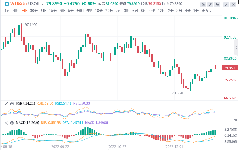 从日线图上看,WTI价格正转向下跌,美国基准原油价格从三周高点81.00美元回落80美元下方。