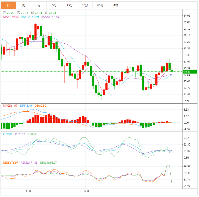 周四盘中,原油交投于78.60附近。油价周三下跌约1%,回吐了稍早的涨幅,对美国可能出现经济衰退的担忧盖过了对取消新冠限制措施将提振其原油需求的乐观情绪。两大指标原油盘中一度触及12月5日以来最高。美国原油九个交易日以来首次收跌。