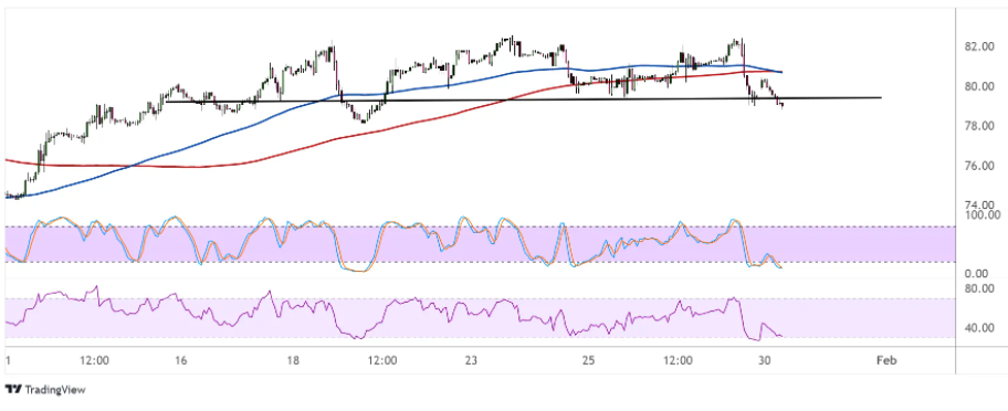 油价的领口在每桶80美元左右,似乎即将出现崩溃。如果发生这种情况,原油价格可能会下滑到与图表模式相同的高度,即每桶80-82美元。