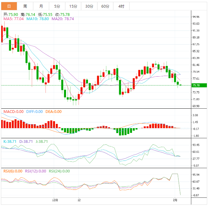 在大幅下跌之后,回落到76.65美元附近的10期均线附近将是一个最佳的卖出机会,这将把资产拉向2月2日的低点75.15美元,然后是1月5日的低点73.00美元附近的水平支撑位。