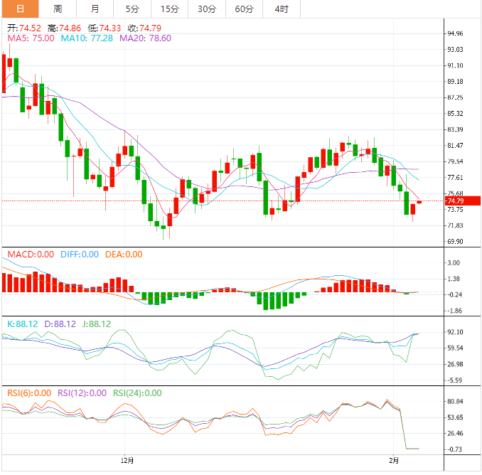 周二亚洲时段,美油交投于74.50美元/桶附近;油价周一震荡交易中攀升近2%,市场在中国需求回升与供应担忧,以及对主要经济体增长放缓抑制消费的担忧之间权衡,中国放宽新冠限制后的复苏前景使油价受到提振,另外,沙特意外上调向亚洲客户出售的石油价格,伊拉克1月产量不足也提振油价。