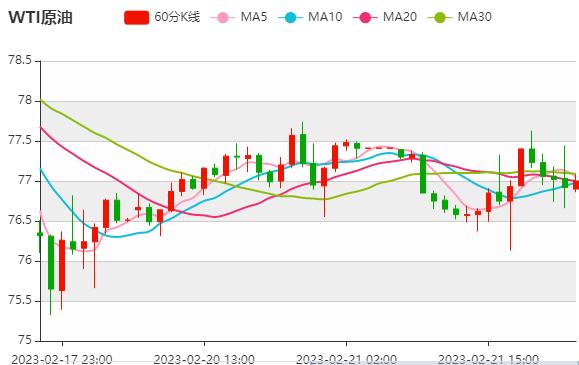 北京时间16:43,NYMEX原油期货上涨0.51%至76.94美元/桶;ICE布伦特原油期货下跌0.68%至83.21美元/桶。(注:由于恰逢美国公共假期,NYMEX原油周一(2月20日)没有结算价。