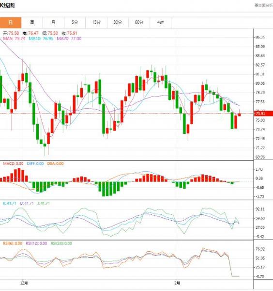 今天的预期交易区间在 74.32 支撑位和 77.23 阻力位之间。今日预期趋势:中性