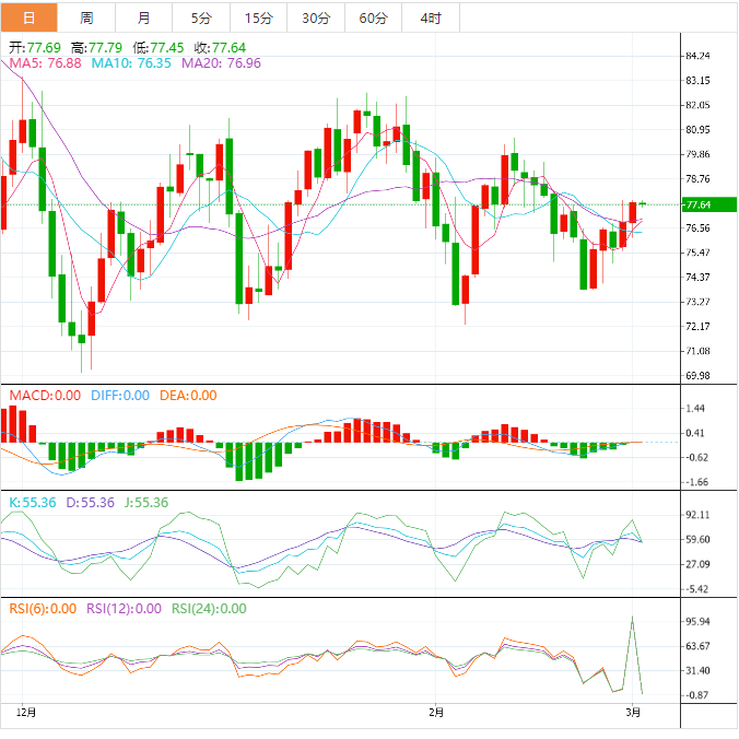 技术面上,50日均线阻力也在该位置附近,若能顶破该阻力,则增加短线看涨信号;进一步阻力在2月16日高点79.52附近,100日均线阻力目前在80.14附近。下方初步支撑在21日均线76.85附近,5日均线支撑在76.44附近,失守该位置前,后市略微偏向多头;周一低点支撑在74.97附近,若意外回落至该位置下方,则削弱短线看涨信号。综合来看,原油今日短线操作思路上贺博生建议以回踩低多为主,反弹高空为辅,上方短期关注78.9-79.4一线阻力,下方短期关注76.6-76.1一线支撑。