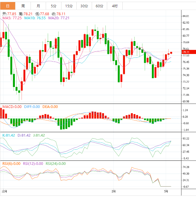 然而,移动均线与中间区间一致,增加了其作为潜在阻力的强度。100移动均线低于200移动均线,表明阻力最小的路径是下行,或者很可能回到每桶73.50美元的支撑位。