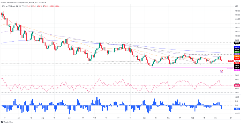 如果继续看空,WTI需要清空74.00美元。一旦完成,下一个支撑位将是2月22日的日低点73.83,然后是2月6日的低点72.30,之后将测试今年以来的低点70.10美元。相反,WTI需要清理77.51- 78.03美元区域,即20日/50日移动均线的汇合点。如果突破该区域,100日均线将暴露在80.31美元。