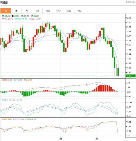 初步阻力在日内高点69.25附近,关键阻力在12月9日低点70.08附近,如果可以收盘在这个位置上方,则削弱后市看空信号。进一步阻力参考2月6日低点72.24附近位置,2月22日低点和10日均线阻力在73.77附近,若能进一步收复该位置,则增加后市看涨信号。