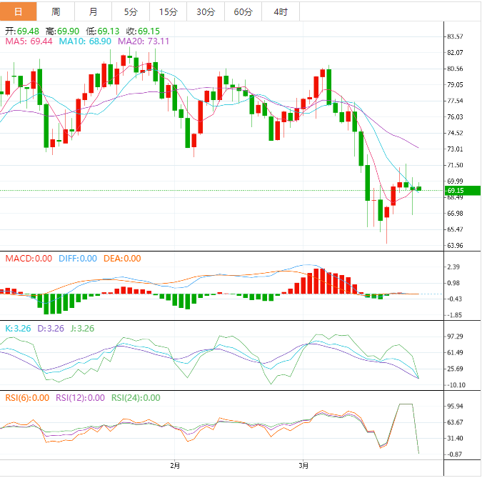 技术面上,目前日线形态偏向于走回落,4小时图慢涨快跌,小碎阳上涨,一根大阴K线全部回吐涨幅。目前开盘价在布林道中轨附近,亚盘若直接失守中轨,则短线转弱向下轨回落。从K线形态来看,走出了冲高回落,上破则调整思路,短线迂回拉锯且反复,结合形态的变化及时作出调整。建议以回踩低多为主,反弹高空为辅,上方短期关注71.1-71.6一线阻力,下方短期关注68.0-67.5一线支撑。