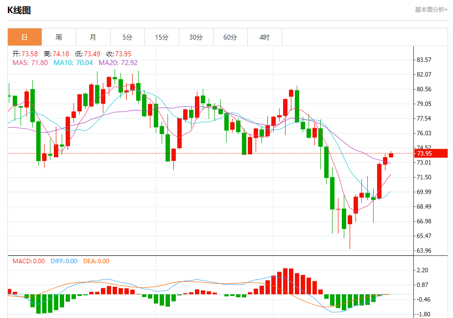 周三盘中,WTI原油报74.16,涨幅0.82%。