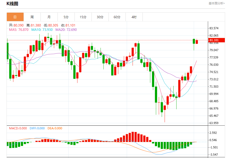 周二盘中,WTI原油报81.470,涨幅1.26%。