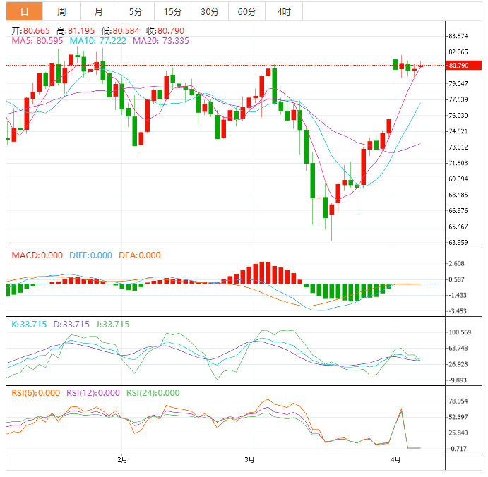 技术面上,周一低点支撑在78.98附近,3月9日高点支撑在78.03附近,失守该位置前,后市仍留有震荡上破的可能性。100日均线支撑76.76附近。10日均线和55日均线支撑76.05附近,该位置也接近上周五高点支撑,也是周一跳空上涨缺口的下沿支撑所在,目前仍不能完全排除油价回补缺口的可能性。