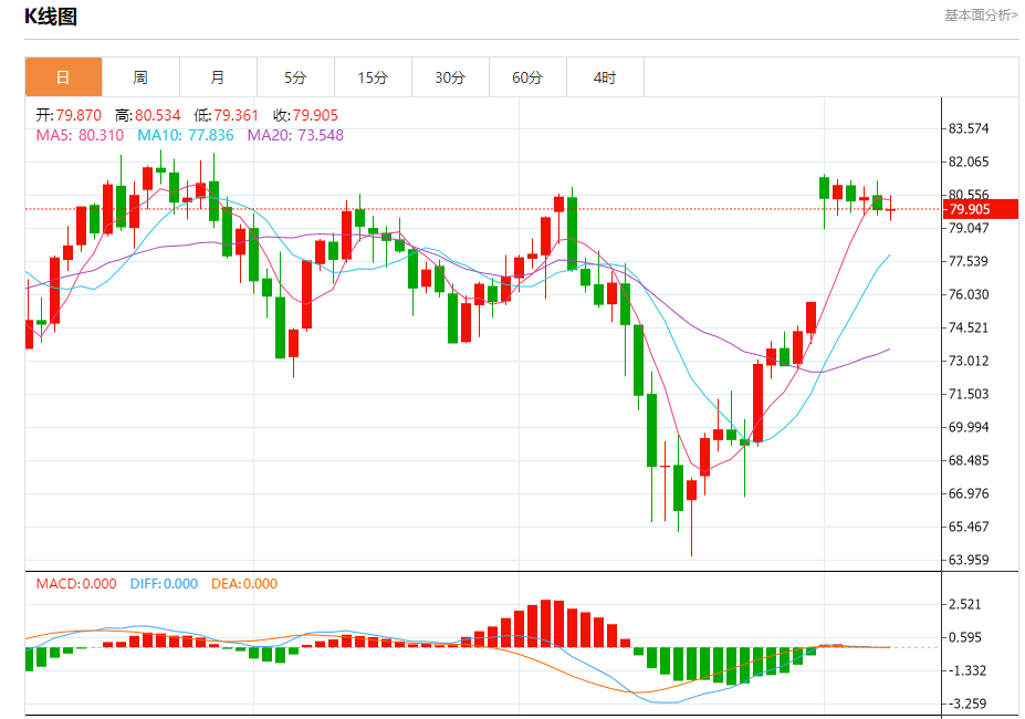 周二盘中,WTI原油报80.281,涨幅0.48%。