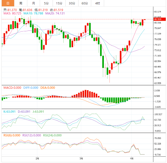 技术面上,原油日线级别高位震荡,油价仍在80关口上方震荡,技术面信号与上一交易日变化不大,MACD金叉信号延续,布林线开口,失守10日均线77.88前,油价仍偏向震荡上攻,初步阻力继续参考上周高点81.79附近位置,建议以回调低多为主,反弹高空为辅,上方短期重点关注82.5-83.0一线阻力,下方短期重点关注80.4-79.9一线支撑。