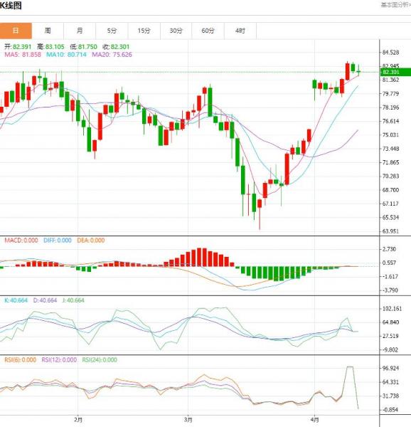 在200日均线附近和近五个月高点附近受阻后,油价有所回落。KDJ高位行情已经非常弱势,油价短期内见顶风险有所增加。因MACD金叉良好运行,布林线开口,如果5日均线能够维持,这意味着油价的短期回调只是对突破4月4日高点后反弹的确认,油价在未来仍趋于看涨。一旦突破200日均线阻力(目前在83.03左右,也可以继续参考12月1日83.31位置),这将增加中线的看涨信号,并有望开辟一条新的上行通道,目标区域预计将在11月达到93.71的高峰期。