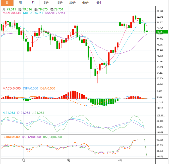 技术面上,由于MACD金叉信号仍在,在跌破缺口上沿78.98前,油价后市仍留有震荡走高的机会,初步阻力在5日均线81.43附近,200日均线阻力目前在82.73附近,若能顶破该阻力,则增加后市看涨信号;近期高点阻力在83.51附近,11月10日高点阻力在84.70附近,一旦顶破该阻力在,则油价可能会加速上涨。