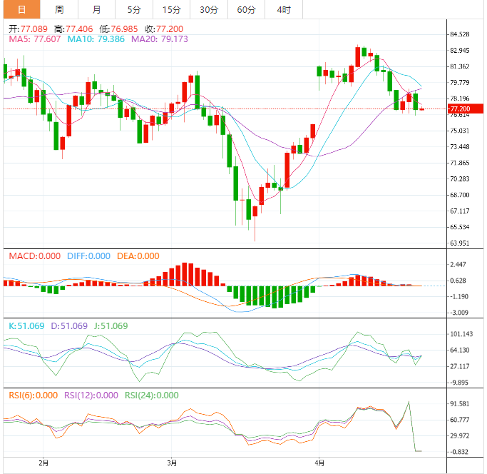 尽管API数据显示库存下降且亚洲需求预期乐观,但美国4月消费者信心指数创九个月新低,且疲软财报引发美股创本月迄今最大跌幅,增加经济放缓担忧,油价日内或再度测试55日均线76.45附近支撑,但日内交易还需关注EIA数据。