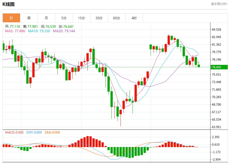 周三盘中,WTI原油报76.551,跌幅0.72%。