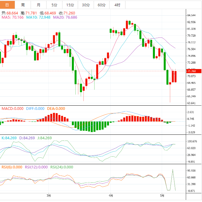 技术面上,近期跌势的38.2%回撤位阻力也在该位置附近,1月5日低点阻力在72.44附近,10日均线阻力在73.49附近,若能收复该位置,则增加后市看涨信号。由于MACD死叉信号仍在,在顶破72.44前,后市仍有重回跌势的风险,初步支撑在日内低点68.47附近,周三低点支撑在67.94附近,3月24日低点支撑在66.81附近,如果失守该位置,则增加短线看空信号。