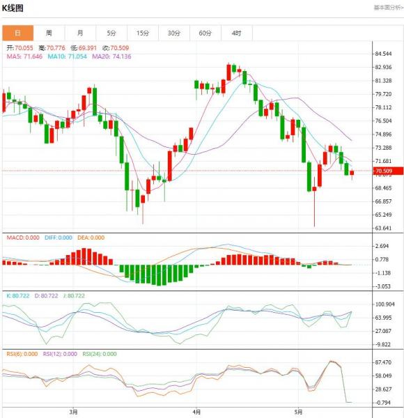 两市稍早创5月5日以来新低,分别至69.41美元/桶和73.49美元/桶。油价此前已连续三个周收跌,人们担心美国可能会在6月的前两周内因历史性违约的“重大风险”而陷入衰退。