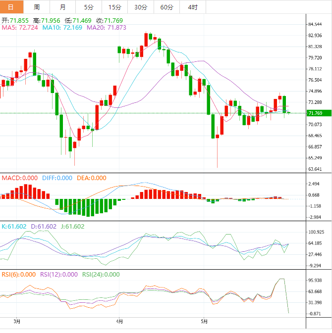 油价正处于从5月4日低点67.47美元向上倾斜的趋势线附近的成或破水平。