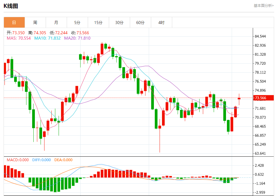 周一盘中,WTI原油报73.590,涨幅2.22%。