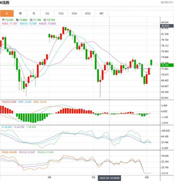 北京时间16:52,NYMEX原油期货上涨2.36%至73.43美元/桶;ICE布伦特原油期货上涨2.22%至77.82美元/桶。两市早盘均创5月2日以来新高,分别至75.03美元/桶和78.73美元/桶,因沙特能源部表示该国7月份产量将从5月份的约1000万桶/日降至900万桶/日。此次减产是该国多年来力度最大的一次。
