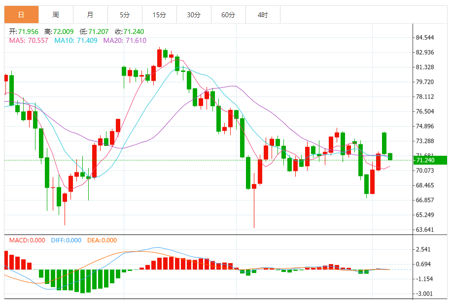 若油价能够守住布林线下轨附近支撑,则后市仍有机会震荡上行,布林线中轨阻力目前在72.07附近,进一步阻力在73.06附近,布林线上轨阻力在73.61附近,若能顶破该阻力,则增加后市看涨信号。