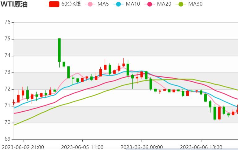 北京时间16:47,NYMEX原油期货下跌2.13%至70.61美元/桶;ICE布伦特原油期货下跌1.92%至75.24美元/桶。国际油价周一(6月5日)一度暴涨逾4%,因世界最大原油出口国沙特阿拉伯在上周末宣布,它将在7月减产100万桶/日至900万桶/日。不过,油价终盘回吐日内多数涨势。