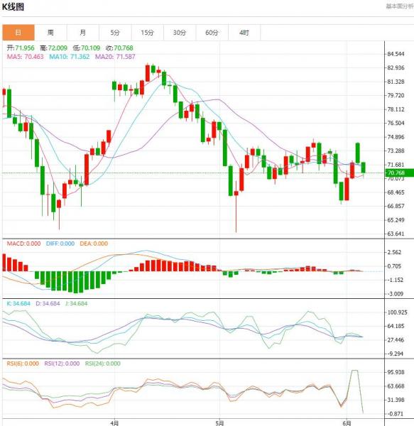 昨天,原油在报复性交易中跌至71.7一线尾盘,今天早盘继续走弱。2小时级别:震荡;布林线轨道运行接近水平,关注布林线轨道70.59-73.55区域突破情况。在技术层面上,原油价格跌破周线MA5均线支撑点71.5.日K线两连阴同时跌破日线中轨布林带,市场正在慢慢消化油价下跌的影响,卖盘强势接管油价。目前,MACD死叉和KDJ死叉表明油价已经从布林线的中间区间下跌,短线偏向于布林线下方70.59附近的支撑。如果这个支撑被突破,它将增加未来市场的看跌信号。