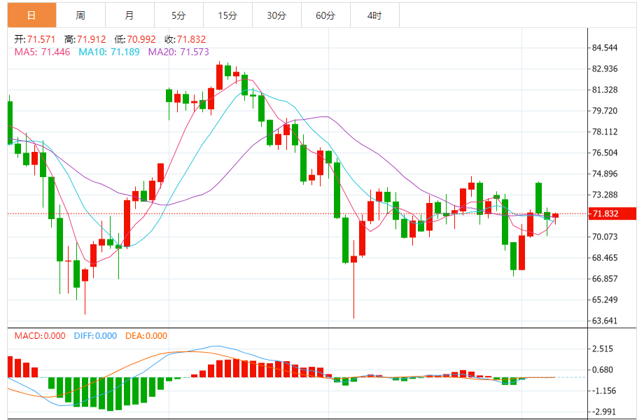 小时图上看,NYMEX原油继续运行在67.04美元-75.03美元区间内。下方支撑看向71.03美元和70.09美元,它们分别是该区间的50%斐波那契回档位和61.8%斐波那契回档位。