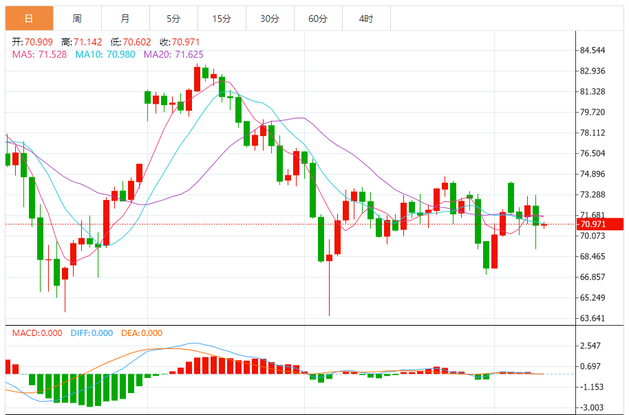 上方布林线中轨阻力在71.70附近,隔夜高点阻力在73.25附近,若能收复该位置,则削弱短线看空信号,若意外强势顶破布林线上轨阻力,则增加后市看涨信号。