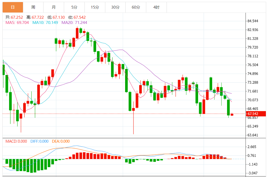日线级别:震荡下跌;MACD死叉,KDJ死叉,布林线初步开口,后市略微偏向空头,油价可能会沿布林线下轨向下运行,初步支撑在隔夜低点66.78附近,3月24日低点支撑也在该位置附近,如果下破该支撑,则增加短线看空信号,油价可能会试探5月4日触及的近一年半低点支撑;短线的话,3月 5日低点65.67附近也还存在一定的支撑。