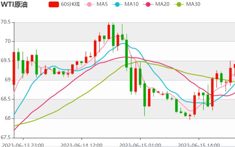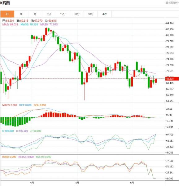 昨天,油价再次下跌,主要是由于EIA周报显示原油和成品油库存过剩超出预期,尽管美联储在6月份暂停了加息,但决议声明有失偏颇,抑制了市场做多的热情。原油在70整数关口附近也有一些阻力,21日均线阻力在71.25附近,6月8日高点阻力在73.25附近。在突破70大关之前,仍有必要防范油价进一步下跌的风险。