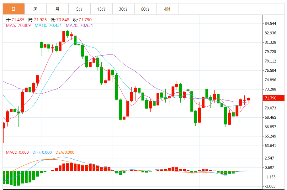 日线图上看,若NYMEX原油自66.80美元开启上行iii浪走势,升破38.2%目标位71.04美元,上方阻力进一步看向61.8%目标位73.65美元。小时图上看,油价自68.14美元开启上行((3))浪走势,上方阻力看向138.2%目标位73.45美元。((3))浪是iii浪的子浪。