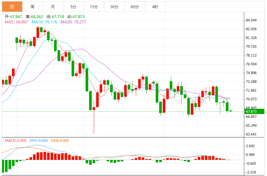 若油价能够守住66.78附近支撑,则后市油价有望延续宽幅震荡走势,初步阻力在5日均线68.88附近,隔夜高点、21日均线和10日均线阻力目前在70.14附近,若能收复该位置,则增加后市看涨信号;进一步阻力参考55日均线72.66附近位置。