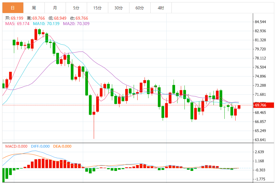小时图上看,NYMEX原油升破69.21美元,短线有望进一步上摸69.88美元,它们分别是72.71美元-67.05美元下跌区间的38.2%斐波那契回档位和50%斐波那契回档位。